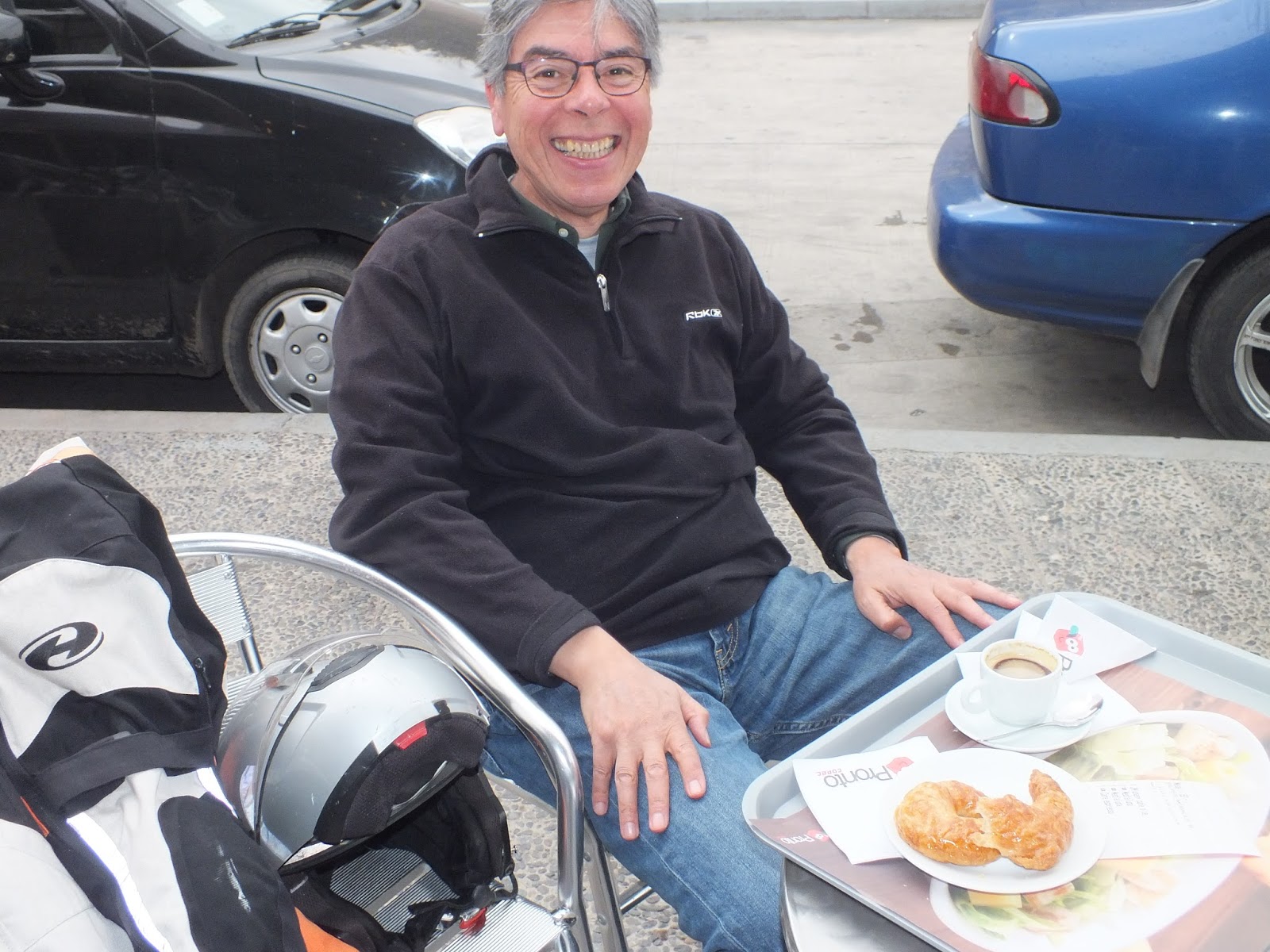 Cuando llegué, Ojitos ya estaba en una mesa afuera, con su cafecito y algo dulce. ¡Que alegría volver a verlo con ropa de moto!
