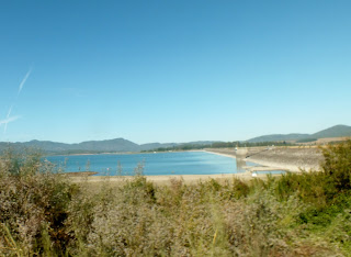 Los cerros son un espectáculo! los colores, las formaciones rocosas, precioso. Cada tanto, avisos de la próxima tronadura,supongo que de los trabajos que vimos en el camino. Luego empezó a verse el embalse Colbún.