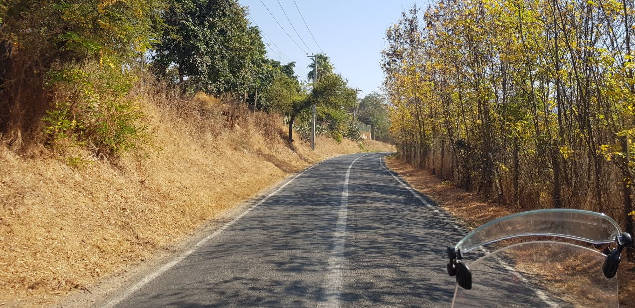 Los campos y los árboles ya están en la transición cromática y la combinación de verdes amarillos y anaranjados es muy muy bonita.Camarón fue en la moto roja, "la chica" como la denomina, con chaqueta amarilla. Elmer en la moto anaranjada. Muy a tono con el paisaje.